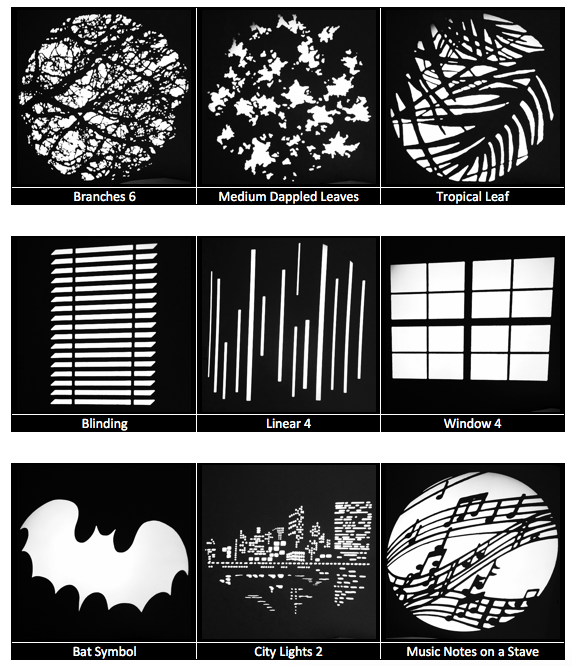 9x Gobos (3 exterior theme, 3 Window theme and 3 special theme - see image)
