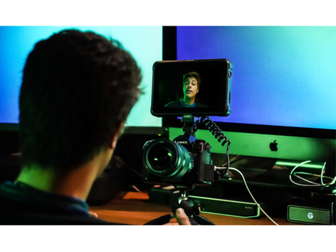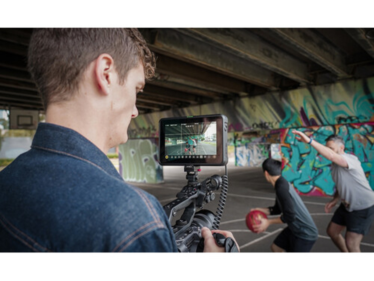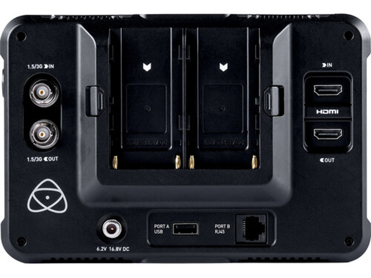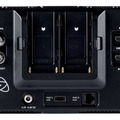 The back of the monitor features dual L-series battery slots for longer shoot durations, and a universal power adapter is also included.
