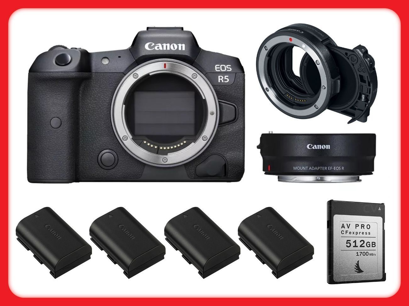 Canon EOS R5 8K Cine Cam + RF-EF Adapter + Variable ND Filter + 512GB CFExpress