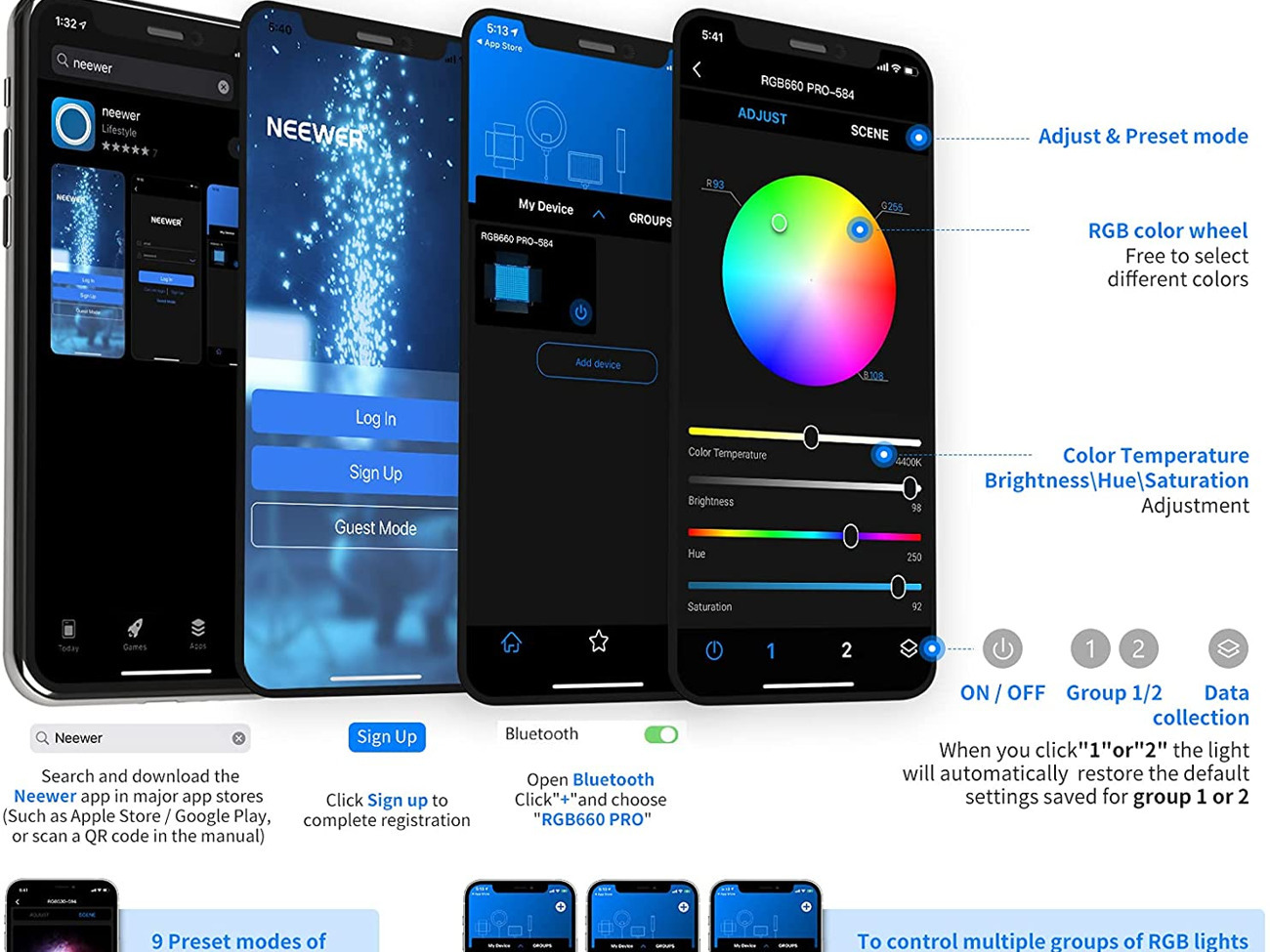 APP INTELLIGENT CONTROL SYSTEM: The light equipped with Mobile App control function, can be controlled by your smart mobile device (above of Android 4.3 or iOS 11.1). Please search and download the Neewer app in major app stores(such as Apple Store/ Google Play, etc). Brightness, Color temperature and Channels (0-8 Channel) can be controlled by APP and designed with Memory Function (2 group parameters can be saved)
