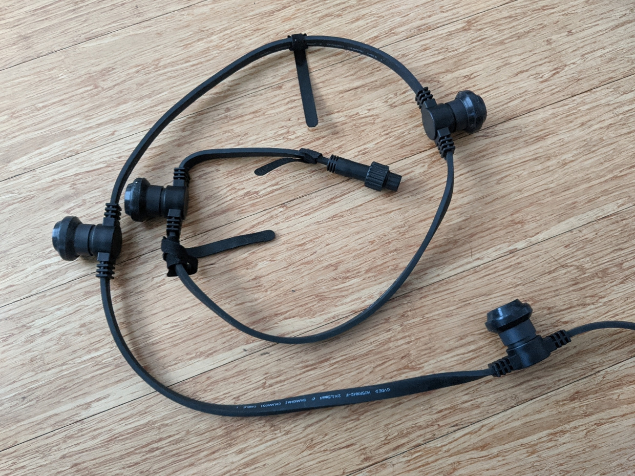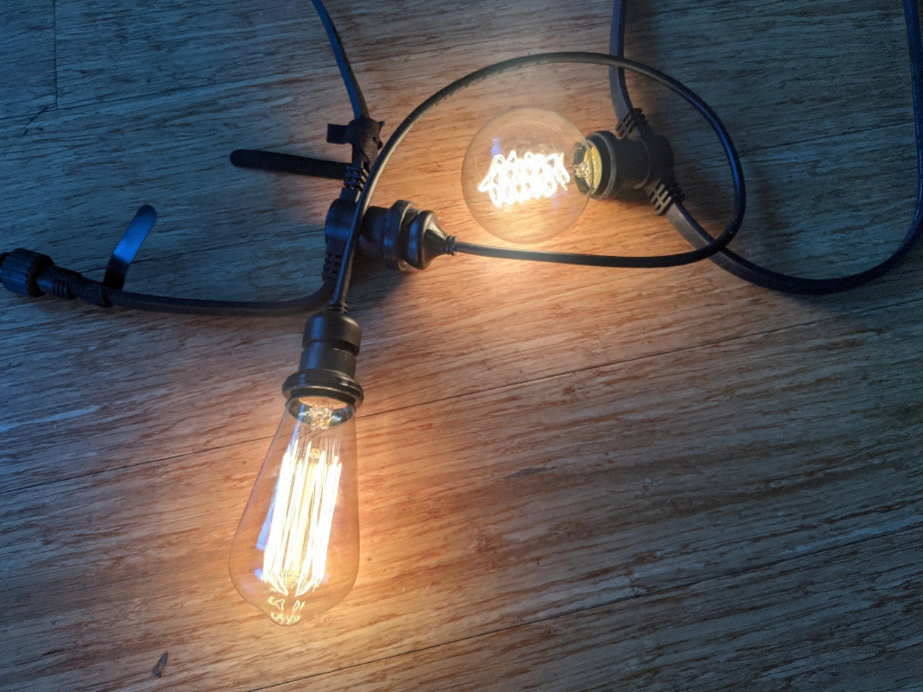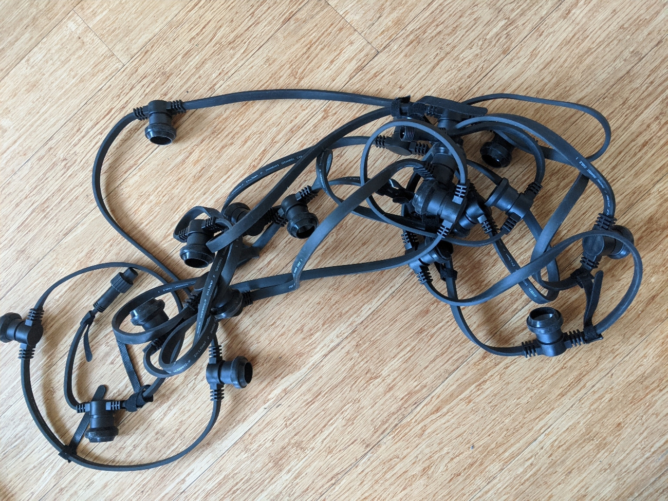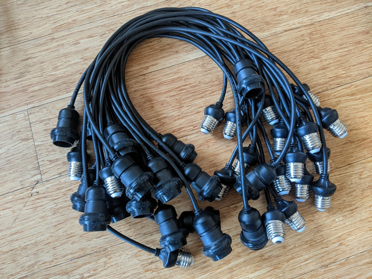 Black festoon wiring and bulb sockets perfect for outdoor lighting for events or video shoots. You'll need to populate the sockets with your own bulbs for your unique look. Need the bulbs lower? It comes with a 2 ft extension socket to remove unsightly main wire. Can also include a 1K dimmer. 10 meters long and has 20 sockets