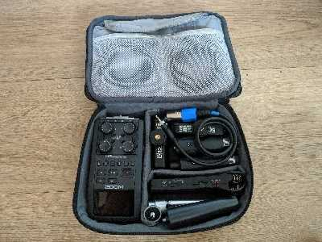 This audio kit comes with zoom H6, zoom H1n, two wireless lav kits and a selection of accessories such as cards and adapters.