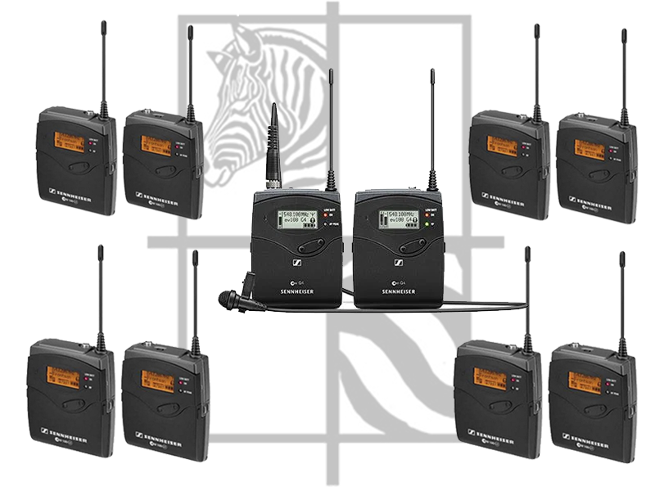 4x Sennheiser G3 Lav Kits (Receiver and Transmitter, Lav, Mic clip, Pop shield, 3.5mm-XLR and 3.5mm to 3.5mm, Coldshoe mount)