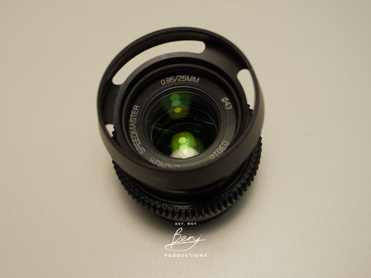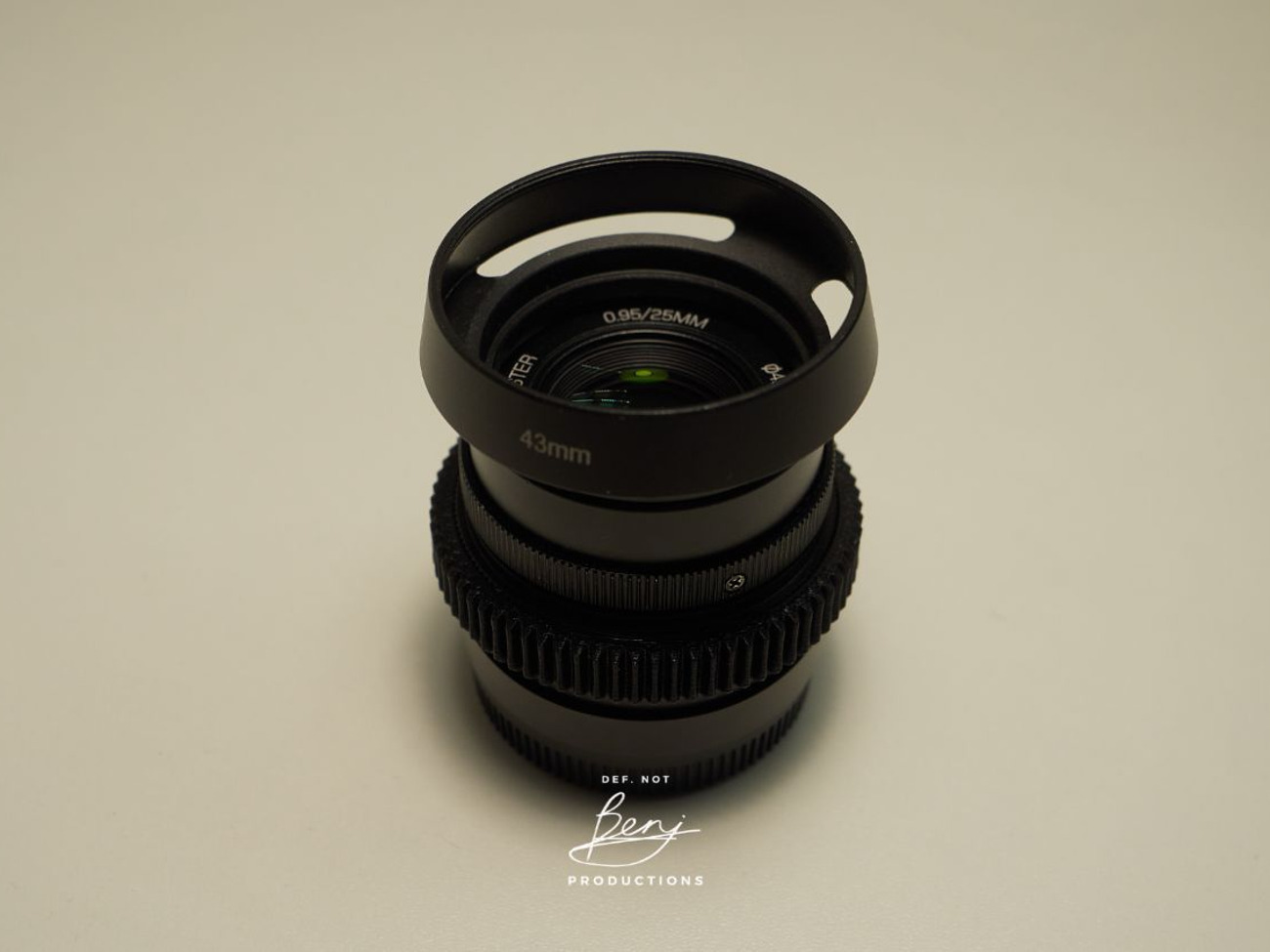 The lens is manual-focus only and thus has no auto-focus. A custom 3D-printed Focus ring is attached to the lens for pulling focus.