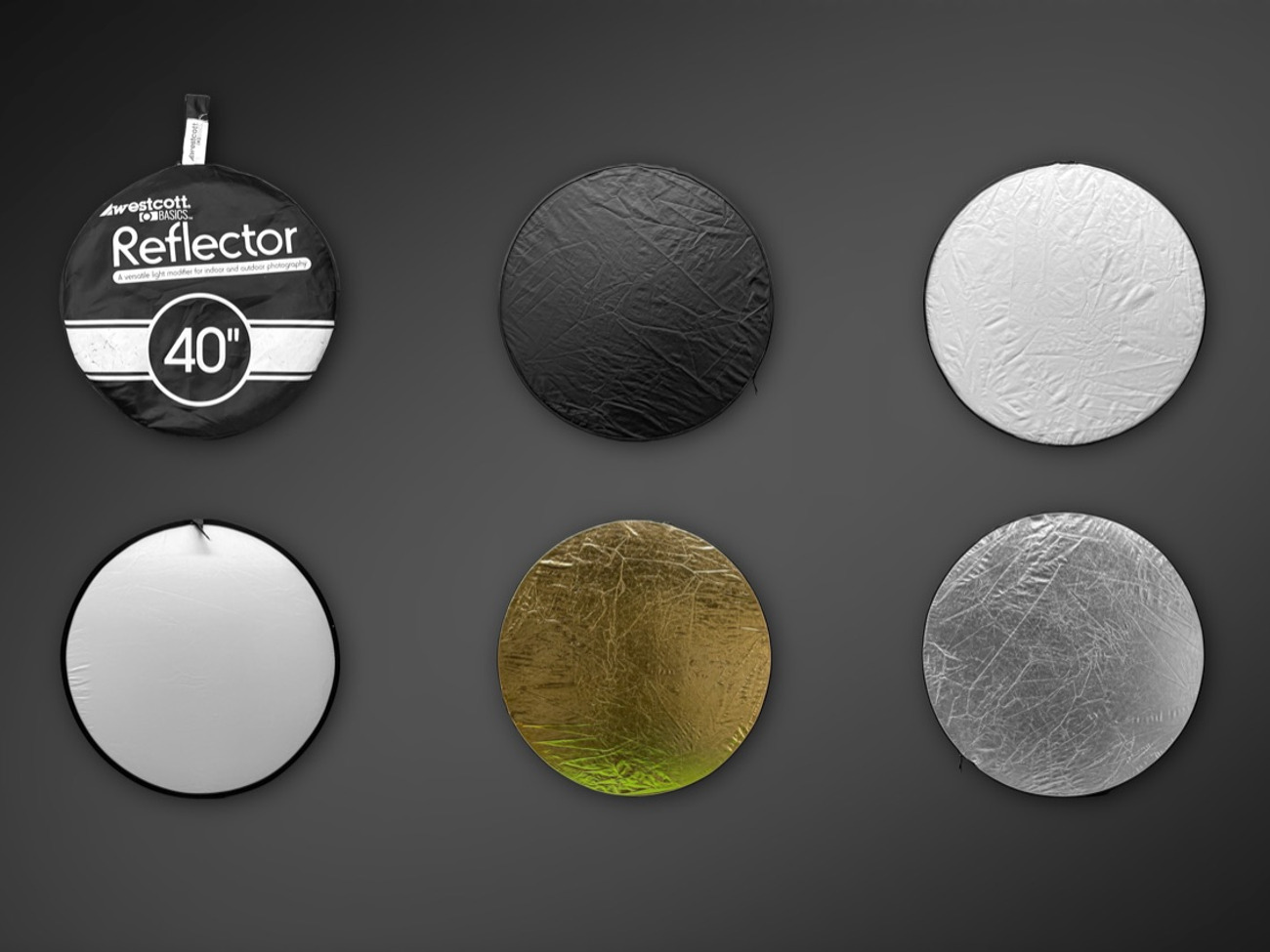 The Photo Basics 5-in-1 Collapsible Reflector Kit is versatile in the field and in the studio, providing shadow-lightening detail in your subject, using available, or studio lighting. It contains a translucent white disc, which is perfect for softening direct sunlight, or lights without diffusion. Use the removable, reversible zippered slipcover to reflect light into shadow areas of your subject. The cover consists of the following colors: silver, gold, white and black.