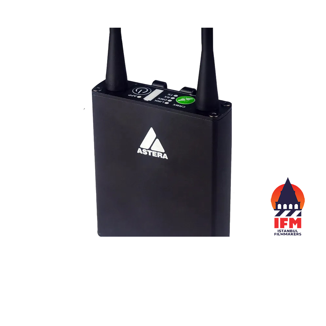 The AsteraBox CRMX Transmitter Box from Astera acquires Bluetooth signal from the AsteraApp, then sends RF signals to the battery-powered light. The App lets you create complex colors, effects, and settings that will be remembered by the lights without a constant wireless link.