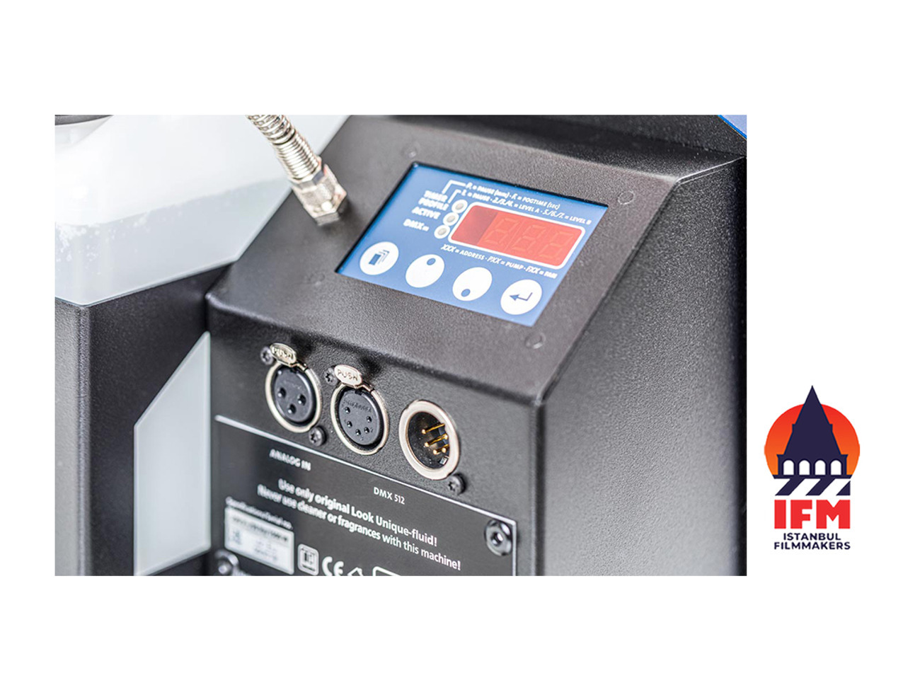 Minimal noise. Pump and fan adjustable separately in 99 steps, therefore variable output (from the finest mist to a thick haze, similar to fog). Internal fan ensures quick and homogen distribution. DMX as standard, analog (0-10V) and stand-alone running. Control of the pump, fan and the adjusting of the DMX start address is achieved with buttons. Internal Timer.