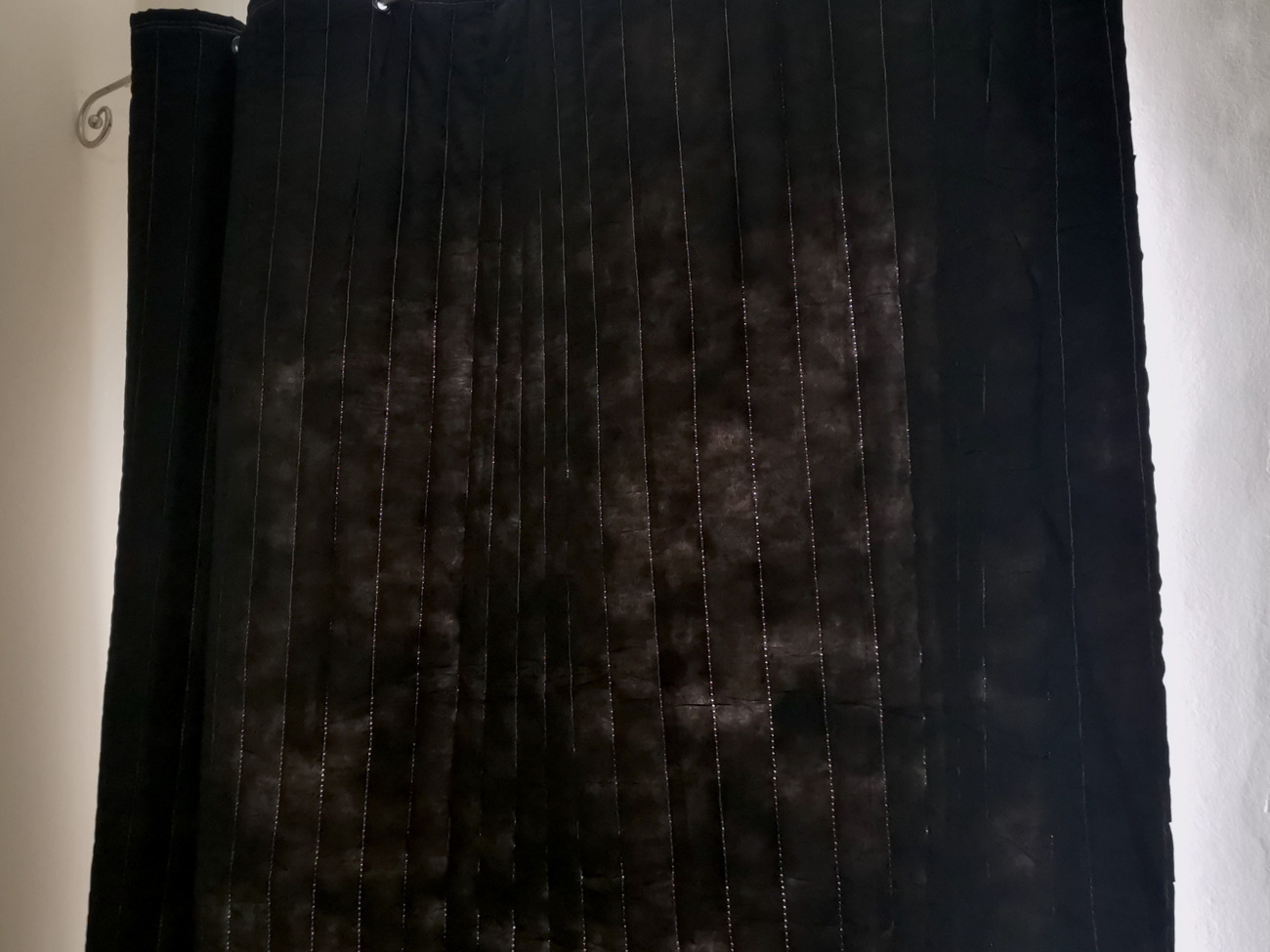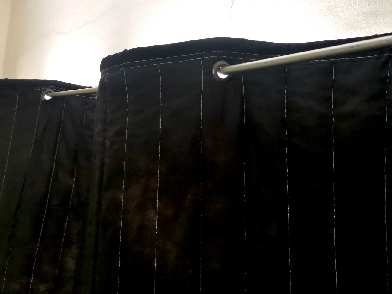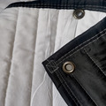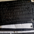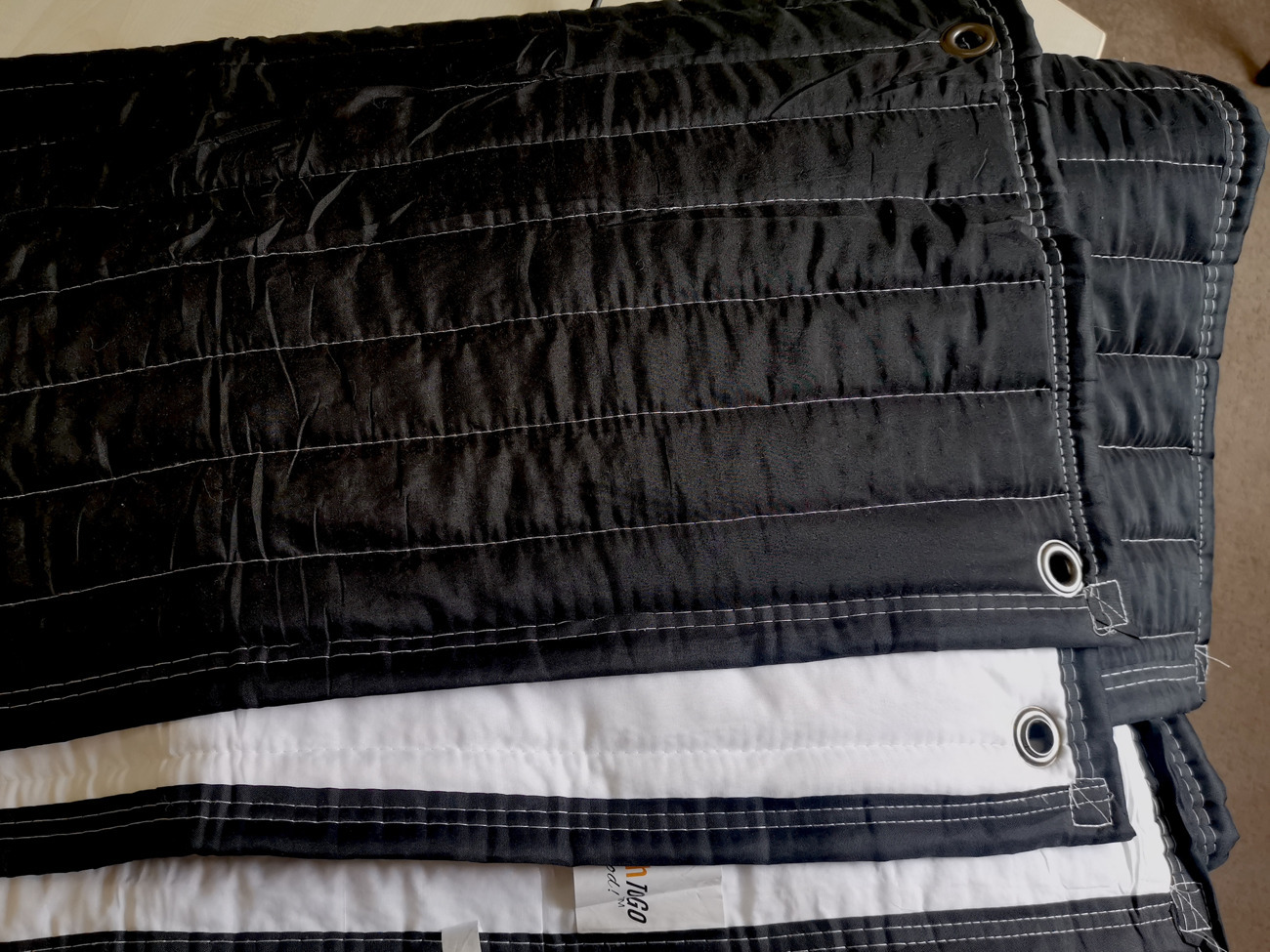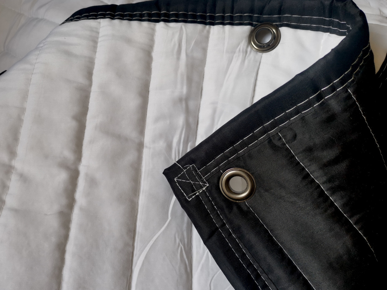 Row of grommets on one side allows blanket to be hung from curtain rail or boom stand. Black on one side and white on the other for bonus of blocking or reflecting light where needed.