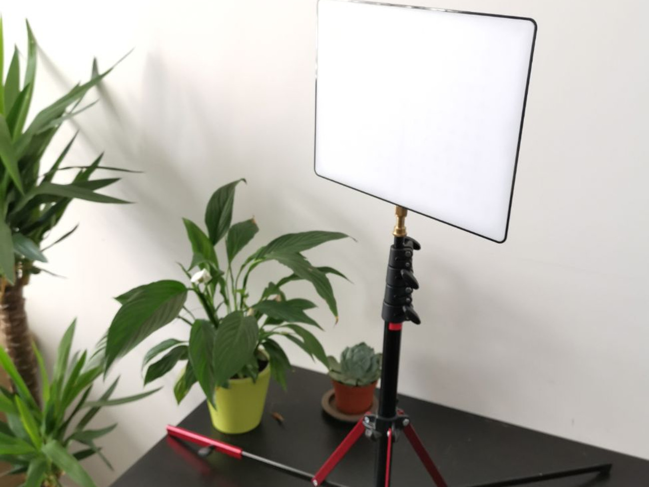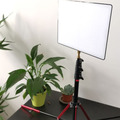 Super lightweight video lighting kit comprising of Yongnuo LED light panel and Manfrotto Nanopole stand, with batteries and power adaptor/wall plug.