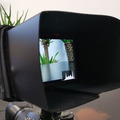 It runs off L Series batteries (1 included) and comes with swivel mount to attach to your camera and a sunhood for outdoor shooting.