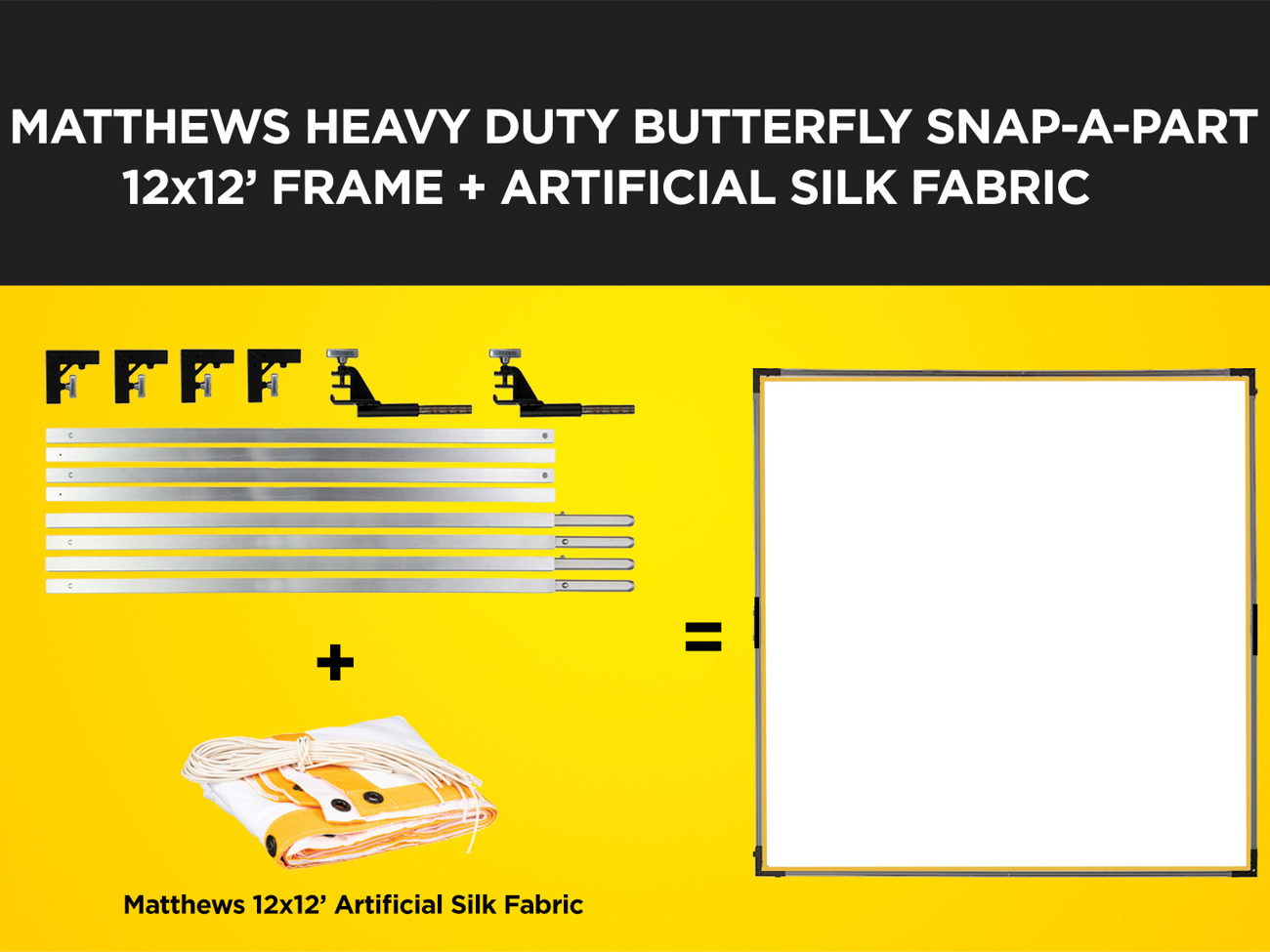 - Matthews 12x12' Overhead/Butterfly Snap-A-Part Heavy Duty Frame (not to be confused with non-heavy duty version) - includes 8 sections of frame that easily snap together, 4x corners and 2x ears for mounting to grip heads