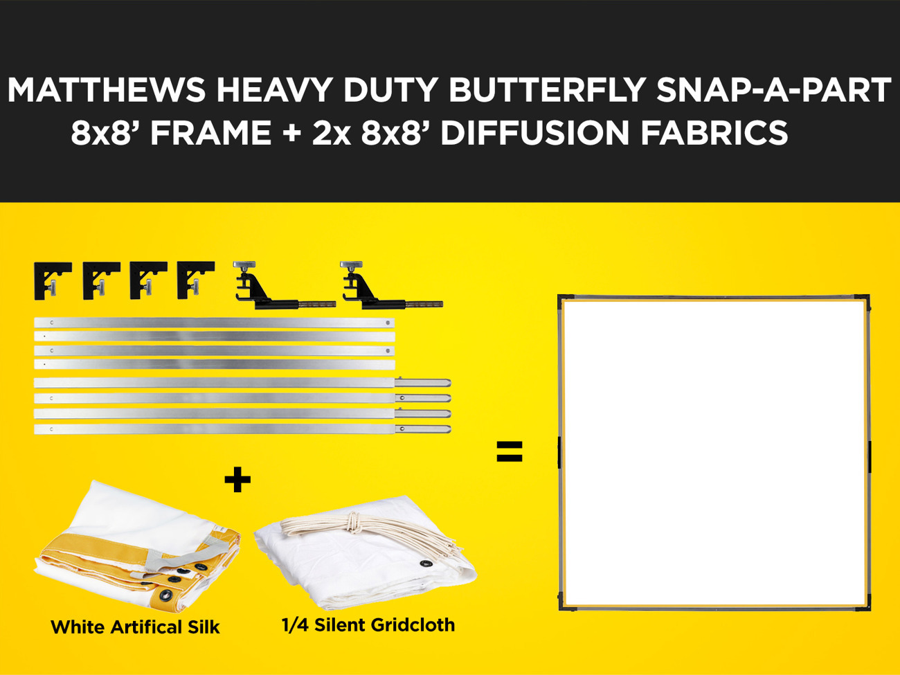 - Matthews 8x8' (2.4x2.4m) Overhead/Butterfly Snap-A-Part Heavy Duty Frame (not to be confused with non-heavy duty version) - includes 8 sections of frame that easily snap together, 4x corners and 2x ears for mounting to grip heads